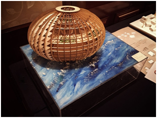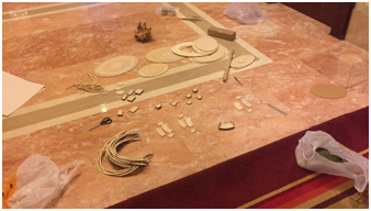 在小组成员的共同努力下,对方案进行建模和制成CAD以供激光切割打印。并获得所有搭建所需的模型零件,打包随同运送到成都。在比赛开始后,随即对所有零件进行归整,并且逐个组装。由于是圆曲面的模型,由于搭建模型经验的不足,搭建的技术难度较大,花费了大量的时间在骨架的建立上。途中经历了许多的曲折,有因为前期建模制CAD阶段的错误导致搭建阶段的繁杂的修正工作,也有对搭建曲面结构的不断探索。在强工作强度下完成了全部骨架和内部建筑的搭建工作。之后立即进行建筑环境营造与模型包装、沙盒的装饰绘画等。