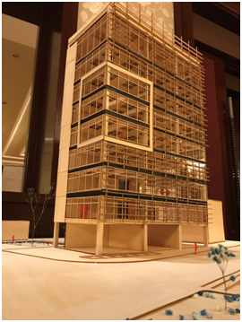 考虑到需要现场搭建以及高校间交流,希望尽可能还原整个建筑的工程搭建过程,参赛队员将梁、柱、楼板、吊顶、龙骨、玻璃、百叶均一一做出来,并在现场搭建,可惜时间有限人数不足,只能完成一个立面的百叶。但整个搭建过程还是吸引了不少关注,期间还得到了众多建筑模型专家的指点。
