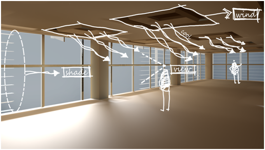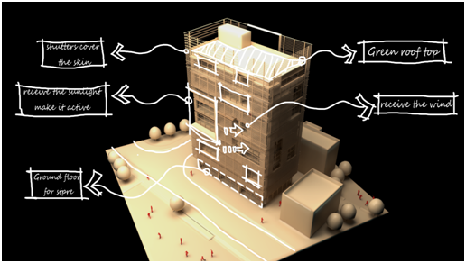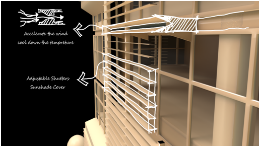 参赛作品主题为“生态之城”:关注降温、通风、隔音的绿色低能耗建筑。希望对现有办公建筑进行被动式技术改进,而我们作品的灵感来源于孟加拉的一款塑料瓶生态空调装置。考虑到岭南地区建筑需要综合考虑遮阳、通风、隔热、采光等需求,参赛队员经过多次小组讨论,决定创造一个构造,将各种功能融合成一个系统。同学们将以往的水平遮阳百叶倾斜两个角度,组合形成了具有大进风口小出风口的通风口,并将其置于吊顶层让新风加速降温后送到室内,起到通风降温的作用。此外,百叶的间距,挑出长度满足当地的遮阳需求。此外还在外立面龙骨间层种植植物,尤其是西面,起到隔热的作用。上述措施(遮阳、通风、隔热)均融合在一套系统当中,使得该栋办公楼更加生态、舒适。
